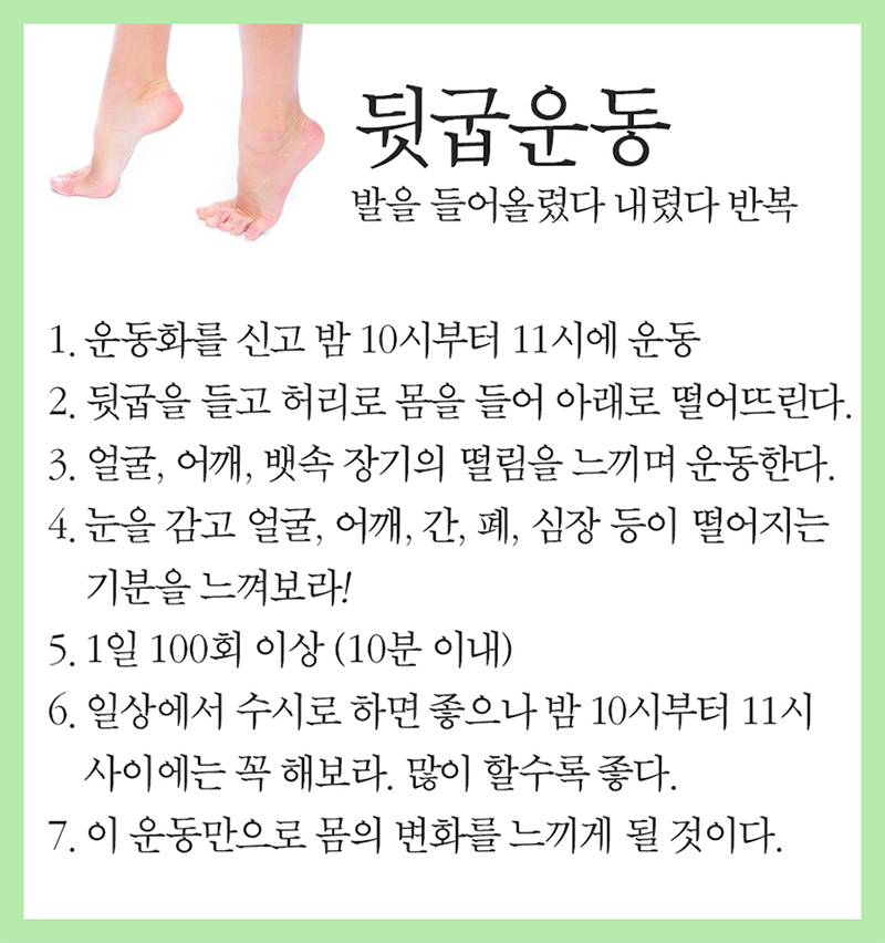 12. 밤 10시~11시 사이 뒷굽 운동을 하면 간과 폐의 열을 내려주고, 장기를 운동시켜 숙면에 도움이 됩니다. 꼭 실천해보세요.